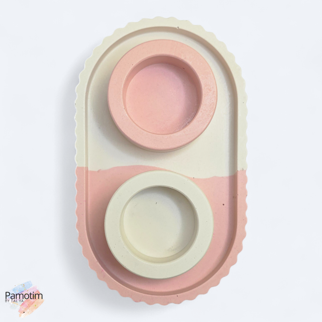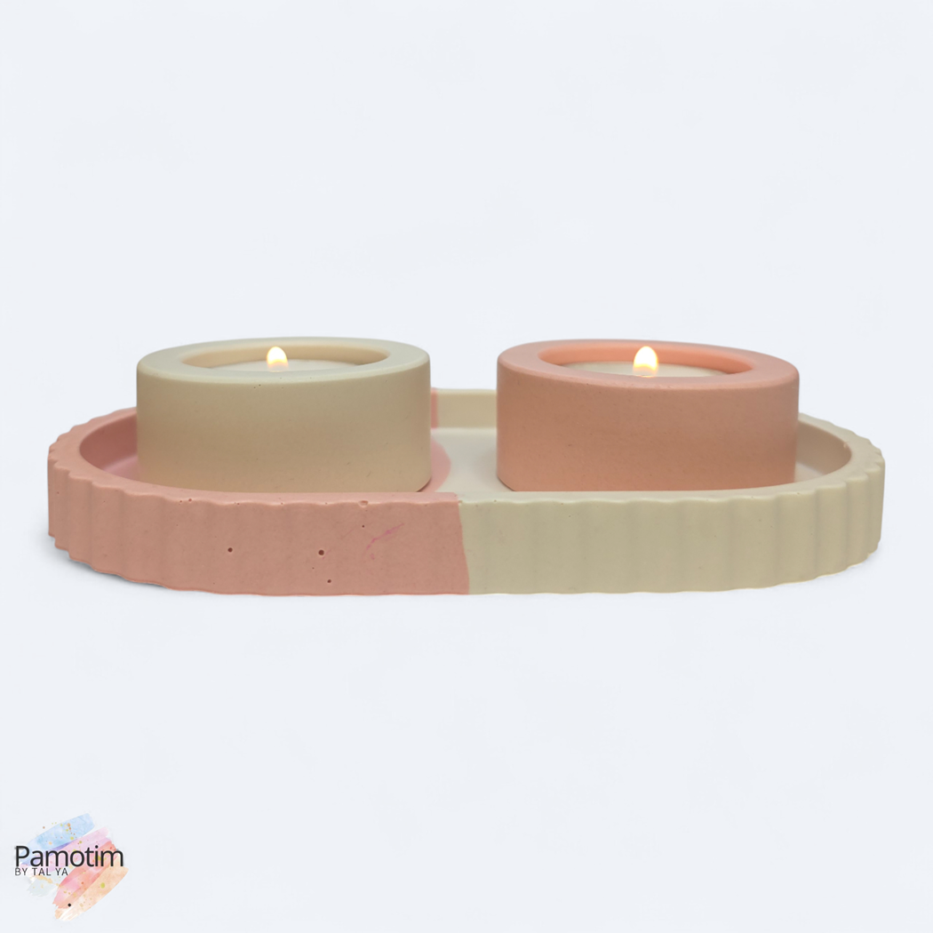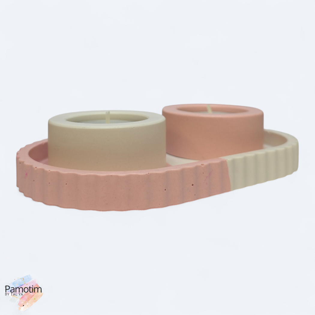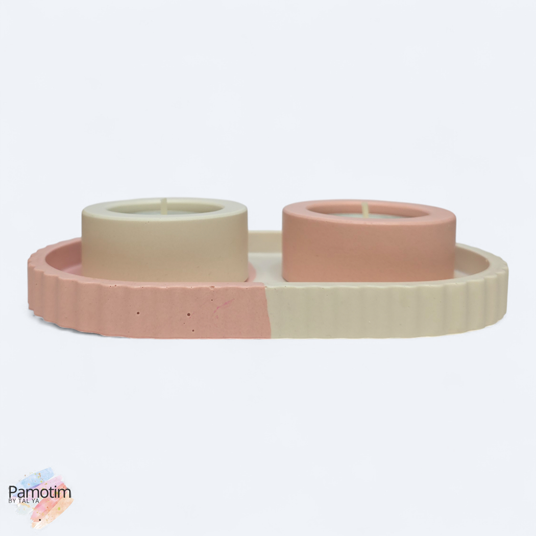 סט פמוטים חלומות ורודים הוא הפריט המדויק שיכניס רוגע טהור ואלגנטיות רכה אל מרכז שולחנכם החגיגי. סט העיצוב המתוחכם הזה הוא הפריט המושלם עבור אלו שמעריכים קו עיצובי נקי ומאופק, אך אינם מוכנים לוותר על חמימות ונגיעות צבע פסטליות. בשילוב גווני ורוד עדין וקרם לבן, בחלוקה אמנותית ומדויקת של הצבעים, המגש משדר שקט ויזואלי המאפיין את הסגנון המודרני העדין. זהו השילוב האולטימטיבי ליצירת אווירה שלווה ואסתטית בכל פינת אירוח.
