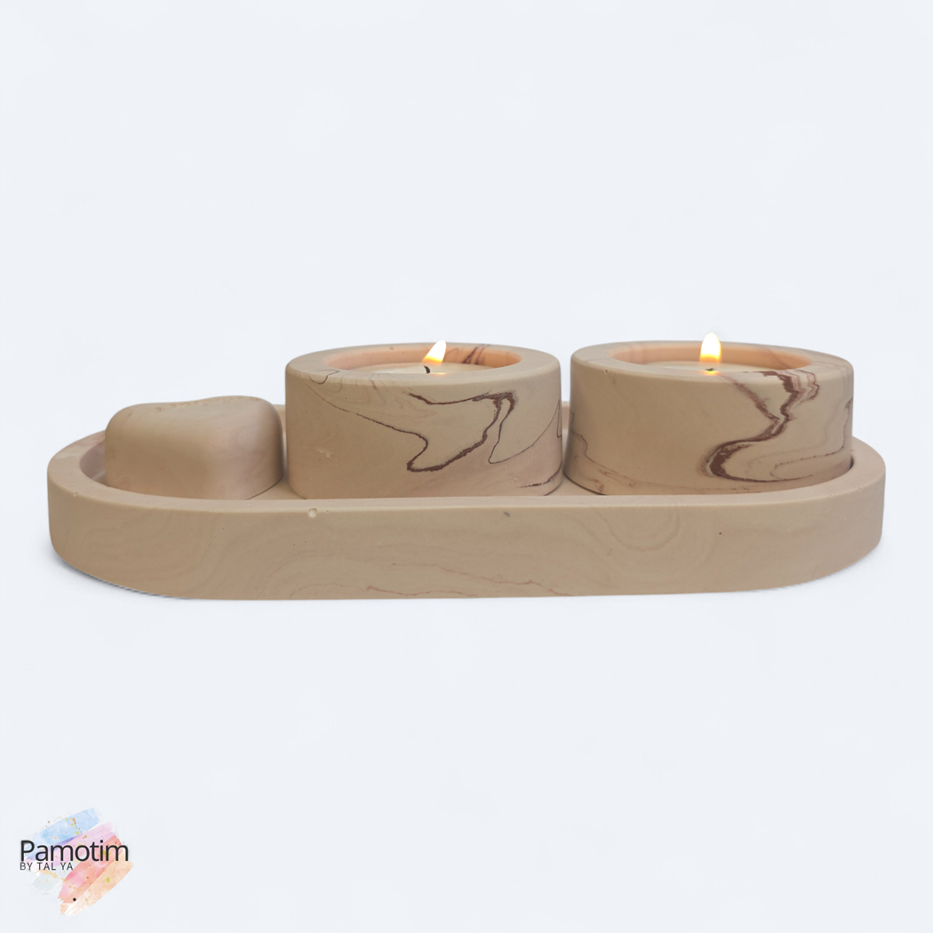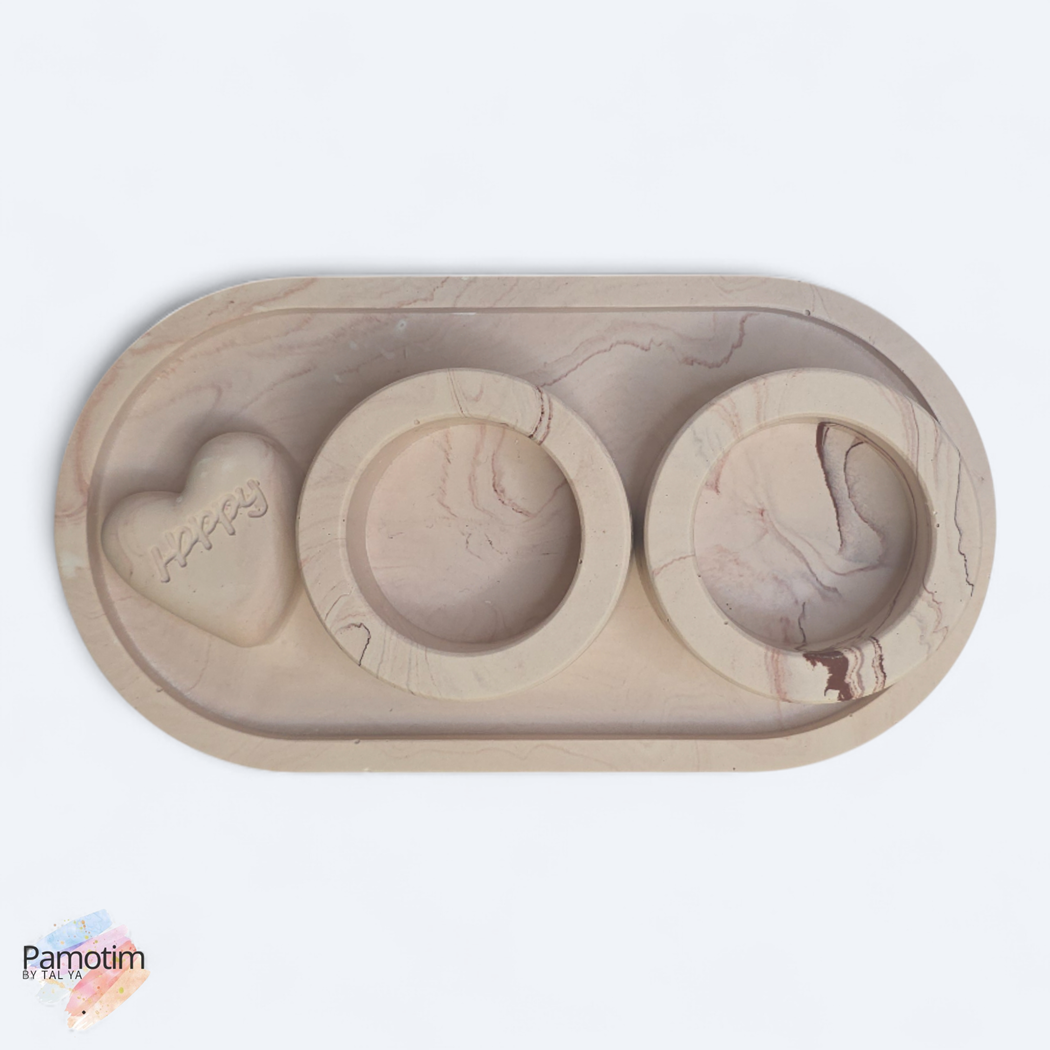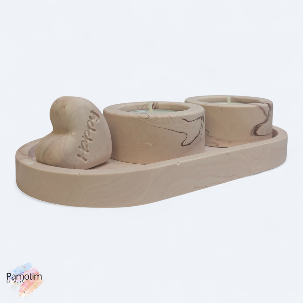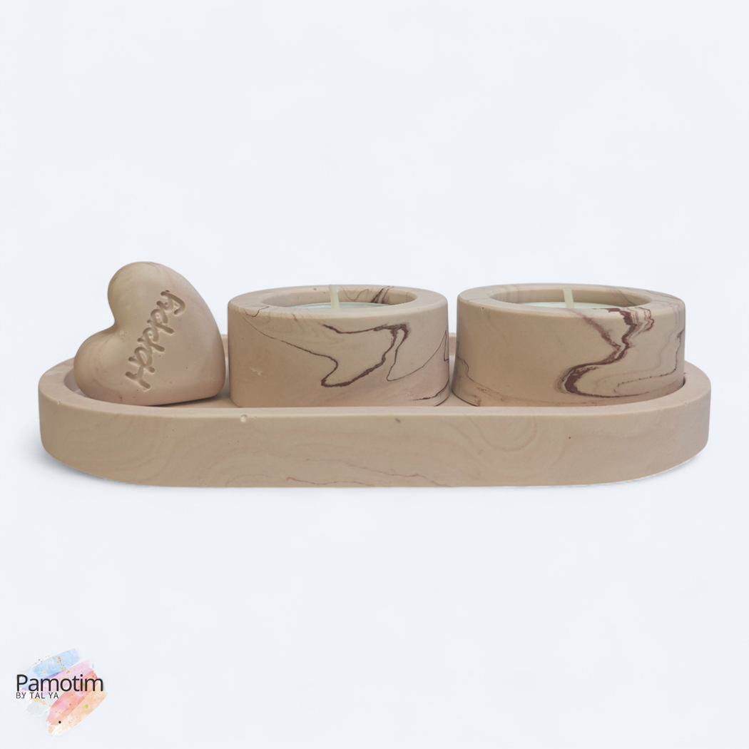 הסט כולל מגש אובלי, שני מחזיקי נרות בגודל סטנדרטי, וקישוט לב תואם שמוסיף חמימות ואופי.