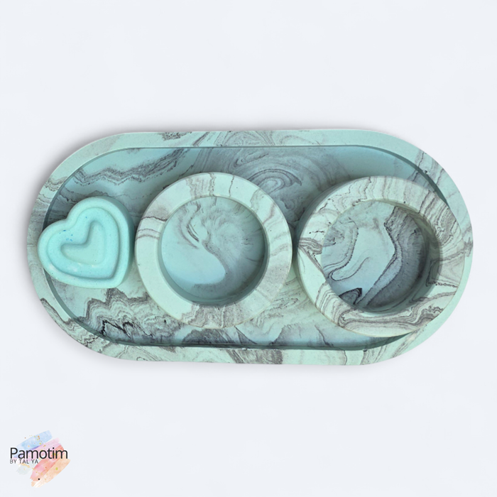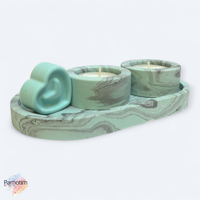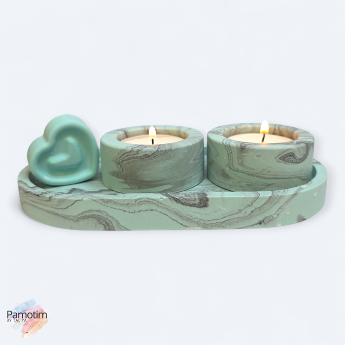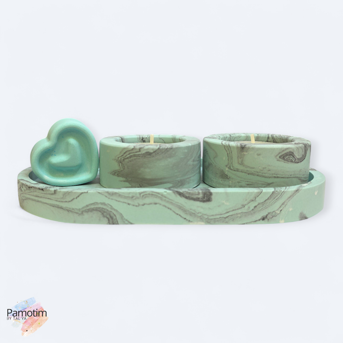 הסט כולל מגש אובלי, שני מחזיקי נרות בגודל סטנדרטי, וקישוט לב תואם שמוסיף חמימות ואופי.
