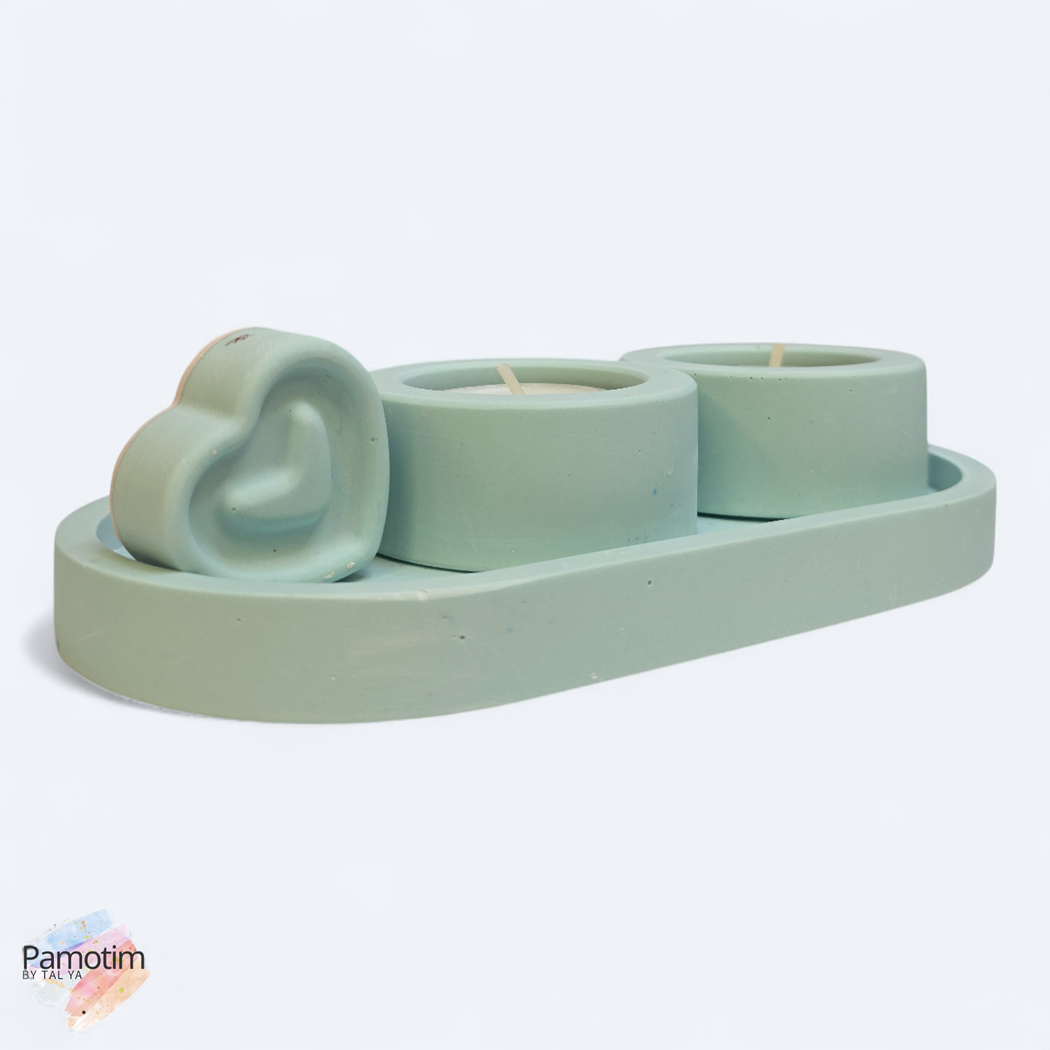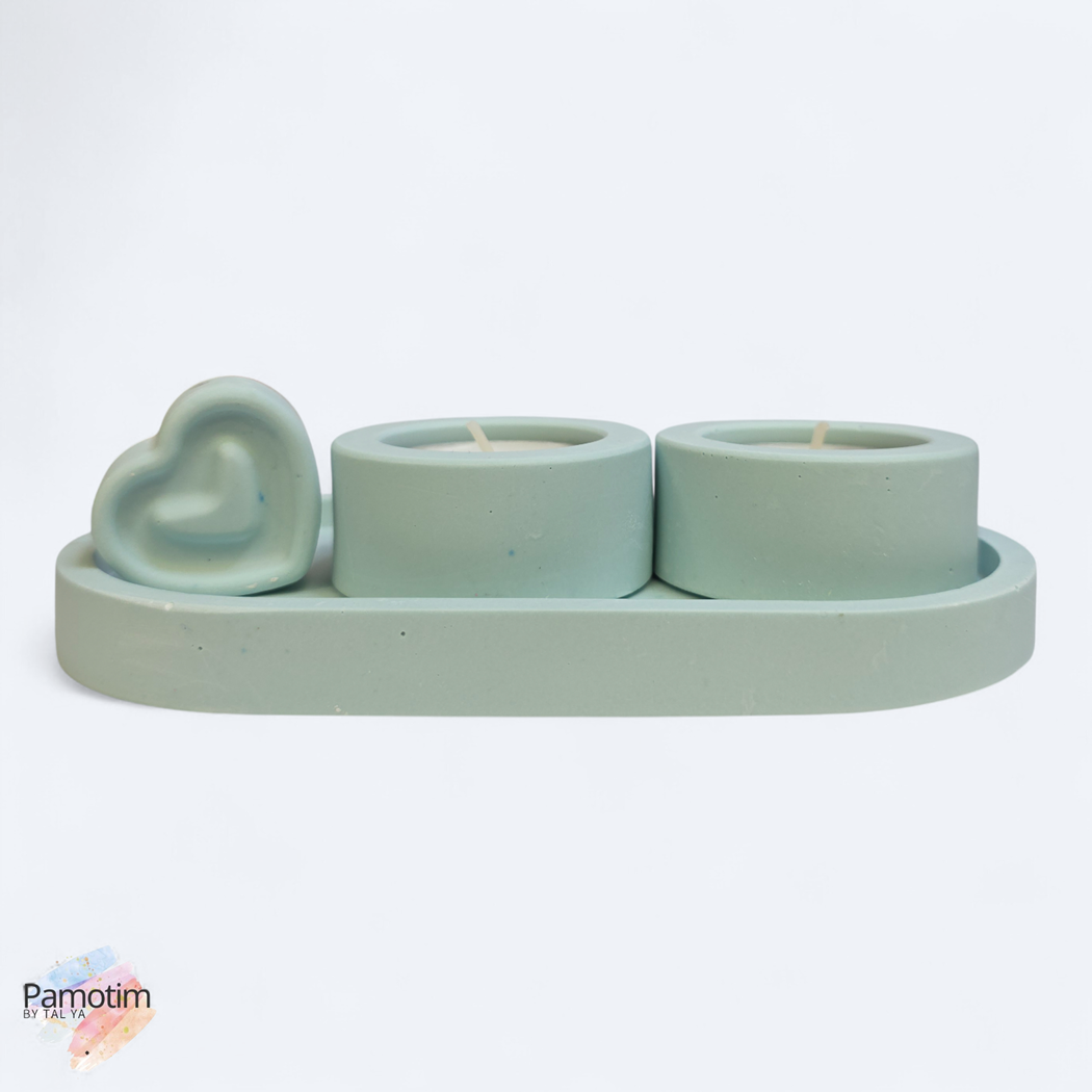 הסט כולל מגש אובלי, שני מחזיקי נרות בגודל סטנדרטי, וקישוט לב תואם שמוסיף חמימות ואופי.